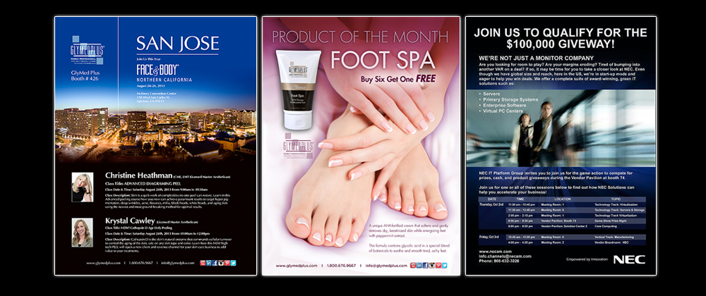 These are magazine ads that were all published. The San Jose ad to the left was published in the Face & Body trade show publication, the ad in the middle was publlished in a skin care publication and the far right was also publised in a trade show publication.